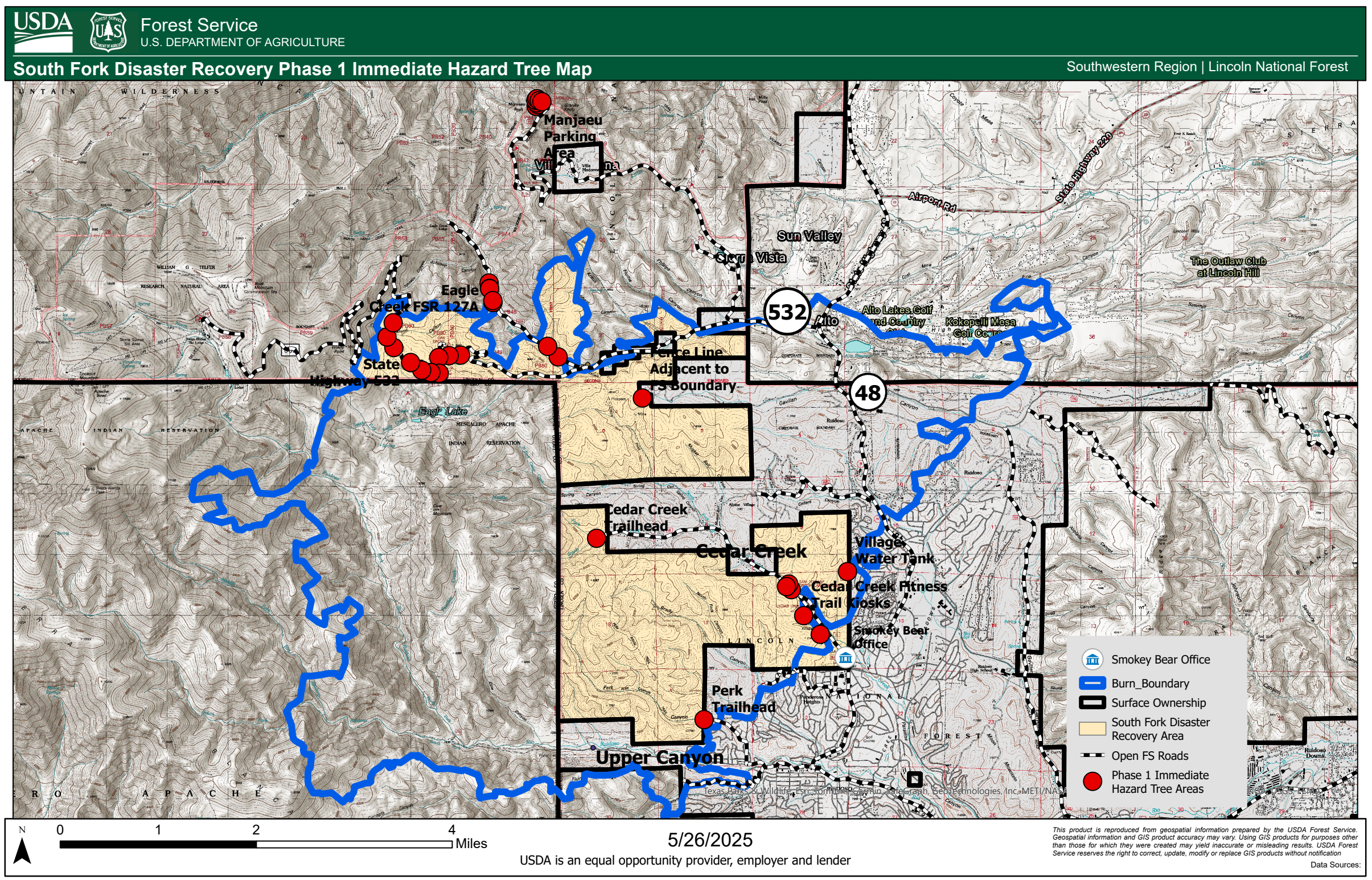 Crews have begun Phase 1 hazard tree mitigation in the Blue 2 and South Fork burned areas of Lincoln National Forest, starting October 10. This critical post-fire recovery effort focuses on high-use areas to enhance public safety and protect Forest Service and adjacent landowner property within the burn scars. Hazard tree mitigation focuses on cutting down standing dead trees that pose an impending danger of falling near major roads, recreation sites (e.g., trailheads, picnic areas, etc.), infrastructure, and areas where the public may concentrate on public land managed by the Forest Service.