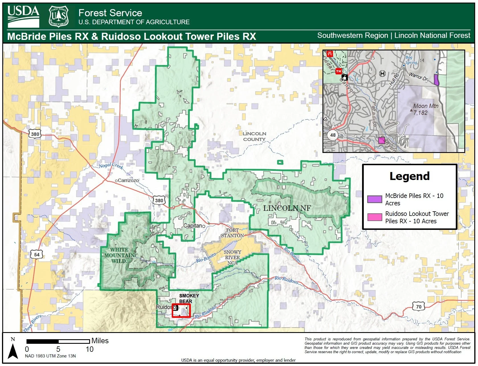 Ruidoso Tower Prescribed Pile Burn: approximately 10 acres of hand piles located around the Ruidoso Lookout Tower on the Smokey Bear Ranger District. Map attached.