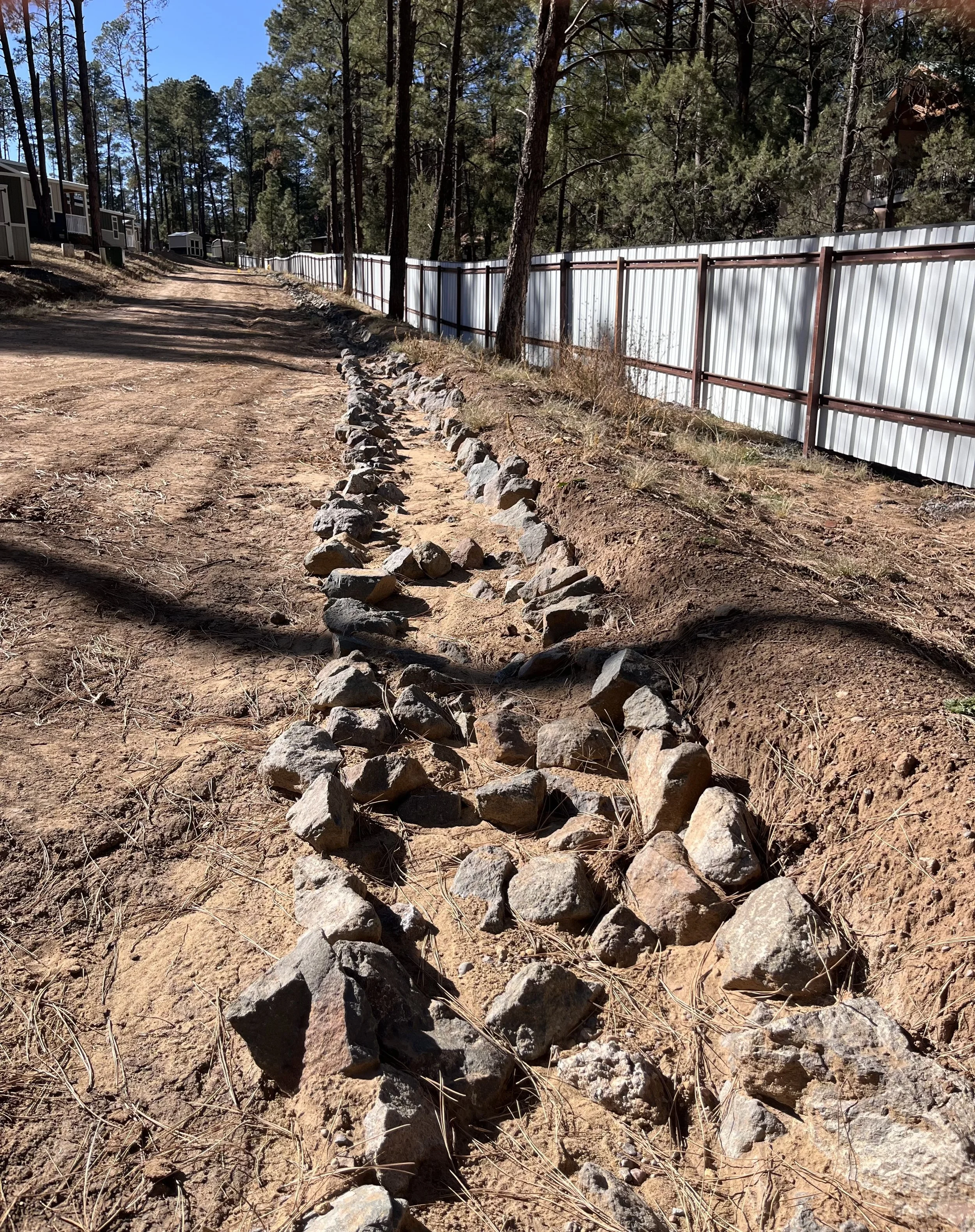 Crews are currently installing concrete curbs, building rock swales around the retaining walls, and finalizing drainage improvements to support long-term site stability. Work is also underway on the detention pool, an essential component of the property’s water management system.