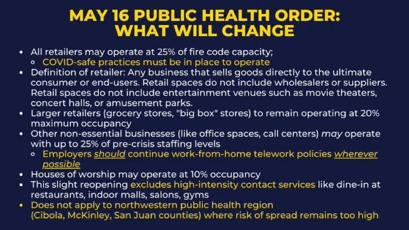 COVID-safe practices for businesses in New Mexico are available online hereand will be updated later this week with individualized practices for specific industries, as well as houses of worship. Important practices retail and other establishments must enact include frequent cleaning and sanitizing of high-touch surfaces; signage to communicate occupancy limits; adherence to maximum occupancy limits per the state emergency public health order; and establishing protocols to allow for contact-less pickup and home delivery wherever possible, among others.