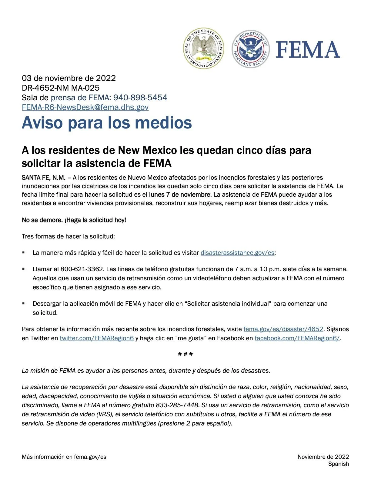 New Mexicans impacted by the wildfires and subsequent flooding from burn scars have only five days left to apply for assistance from FEMA. The final deadline to apply is Monday, Nov. 7, 2022. FEMA assistance can help residents find temporary housing, rebuild their homes, replace destroyed property, and more.