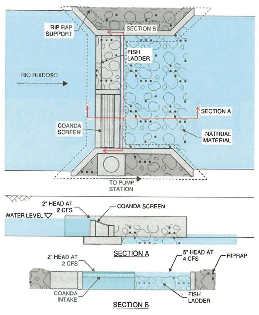 Due to the shallow profile of the Rio Ruidoso, a Coanda screen and self-cleaning mechanism will be installed in the river. The screen separates water from debris using approach velocity flowing over the screen, which acts as a weir — a passive intake that does not retain or hold water. Weir height varies across the river’s width to support fish passage upstream. A submersible turbine pump in marine-rated enclosures, paired with an elevated Electrical, Instrumentation, and Controls (E&IC) platform, will reduce project cost while integrating naturally with the park’s visual character. (See Figure 1) That cuts roughly 25% of the length while preserving all key details — funding figures, dates, contractors, technical specs, and the Coanda screen explanation.
