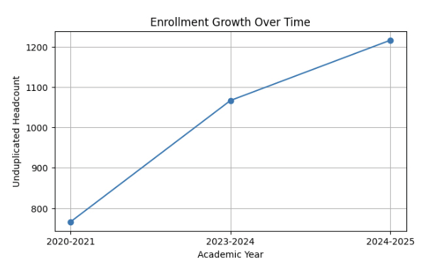 ENMU-Ruidoso released enrollment data on December 12, 2025, showing the fifth consecutive year of enrollment growth. Overall enrollment increased from 766 unduplicated headcounts in 2020-2021 to 1,216 in 2024-2025, representing a 59% increase in unique students served. As well as a 14% enrollment growth in unduplicated headcount over the last year.